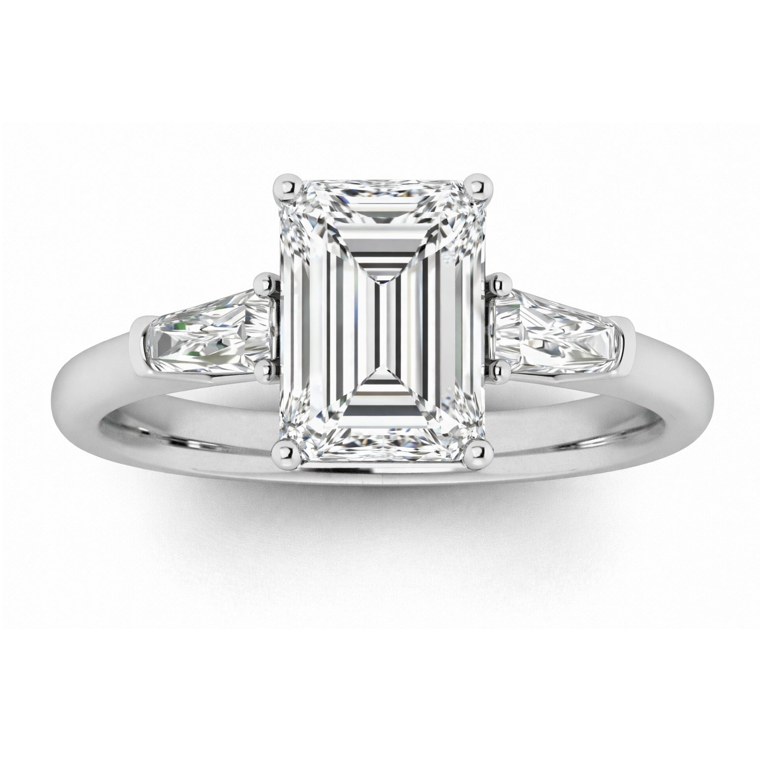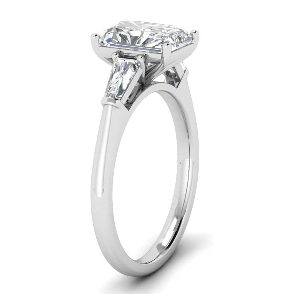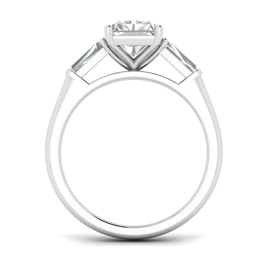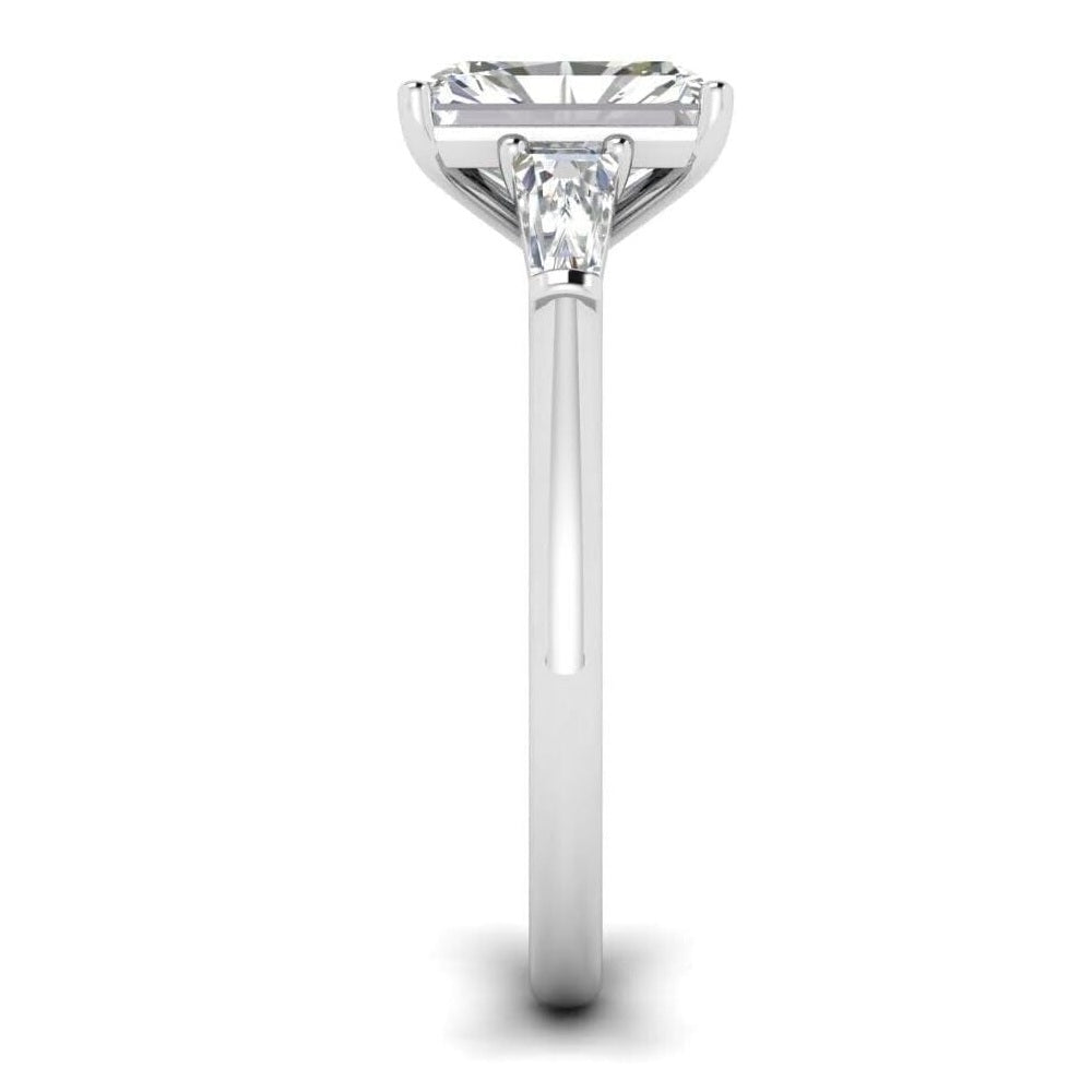 Simply stunning from every angle, this 3-stone emerald cut engagement ring is absolutely divine. Glistening and vibrant emerald cut stones adorn the sides of a stunning emerald cut in the center, complete the design on a solid setting making this ring absolutely breathtaking.