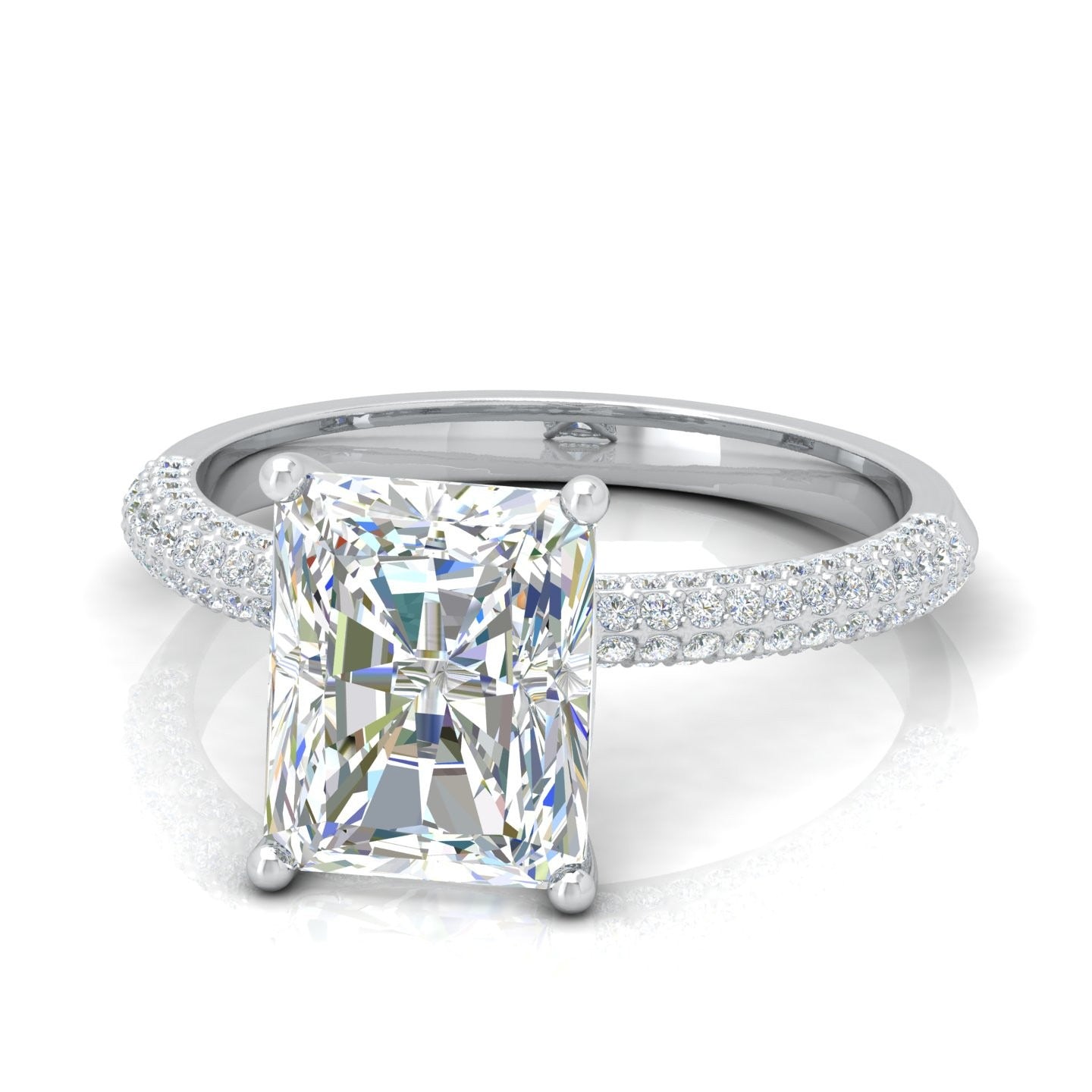 Celebrate your love with this stunning 2.00 carat lab-grown radiant diamond engagement ring in platinum. Featuring a flawless D color and VS clarity, the radiant center stone dazzles with exceptional brilliance. Three rows of side diamonds enhance its sparkle, creating a luxurious and sophisticated design. Ethically crafted and timeless, this ring is the perfect symbol of your commitment and devotion.